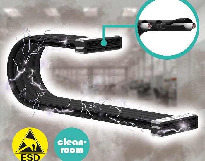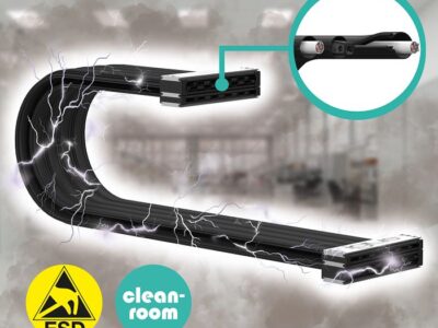 A igus adicionou uma variante ESD específica para salas limpas altamente sensíveis à sua linha e-skin flat. O novo material da fita modular para cabos evita que a esteira fique carregada eletrostaticamente, garantindo ao mesmo tempo que não gere partículas, mesmo durante movimentos muito rápidos. O design modular com compartimentos individuais também permite o rápido preenchimento do sistema de fornecimento de energia.