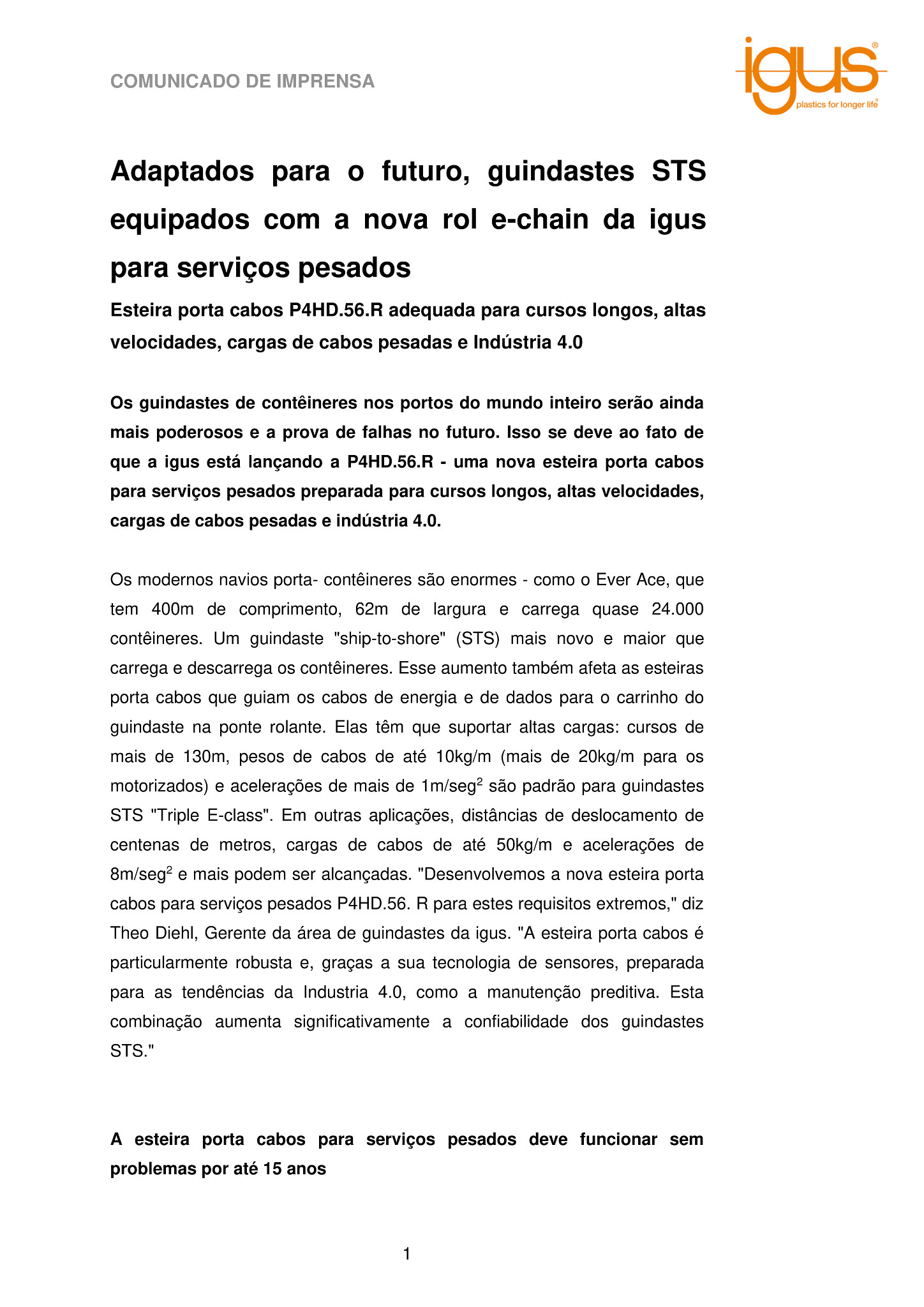 Os modernos navios porta- contêineres são enormes – como o Ever Ace, que tem 400m de comprimento, 62m de largura e carrega quase 24.000 contêineres. Um guindaste “ship-to-shore” (STS) mais novo e maior que carrega e descarrega os contêineres. Esse aumento também afeta as esteiras porta cabos que guiam os cabos de energia e de dados para o carrinho do guindaste na ponte rolante. Elas têm que suportar altas cargas: cursos de mais de 130m, pesos de cabos de até 10kg/m (mais de 20kg/m para os motorizados) e acelerações de mais de 1m/seg2 são padrão para guindastes STS “Triple E-class”. Em outras aplicações, distâncias de deslocamento de centenas de metros, cargas de cabos de até 50kg/m e acelerações de 8m/seg2 e mais podem ser alcançadas. “Desenvolvemos a nova esteira porta cabos para serviços pesados P4HD.56. R para estes requisitos extremos,” diz Theo Diehl, Gerente da área de guindastes da igus. “A esteira porta cabos é particularmente robusta e, graças a sua tecnologia de sensores, preparada para as tendências da Industria 4.0, como a manutenção preditiva. Esta combinação aumenta significativamente a confiabilidade dos guindastes STS.”