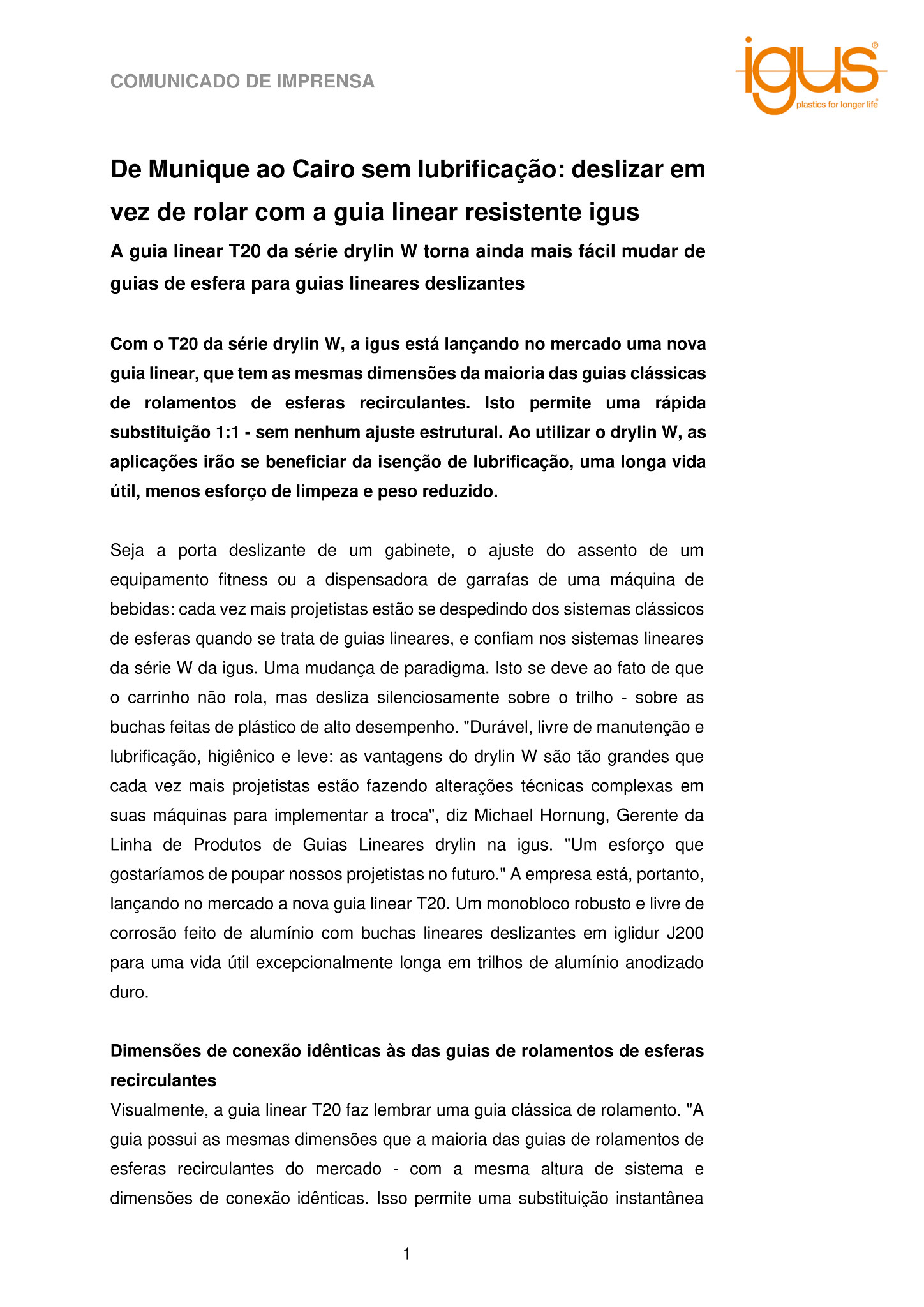 Com o T20 da série drylin W, a igus está lançando no mercado uma nova guia linear, que tem as mesmas dimensões da maioria das guias clássicas de rolamentos de esferas recirculantes. Isto permite uma rápida substituição 1:1 – sem nenhum ajuste estrutural. Ao utilizar o drylin W, as aplicações irão se beneficiar da isenção de lubrificação, uma longa vida útil, menos esforço de limpeza e peso reduzido.