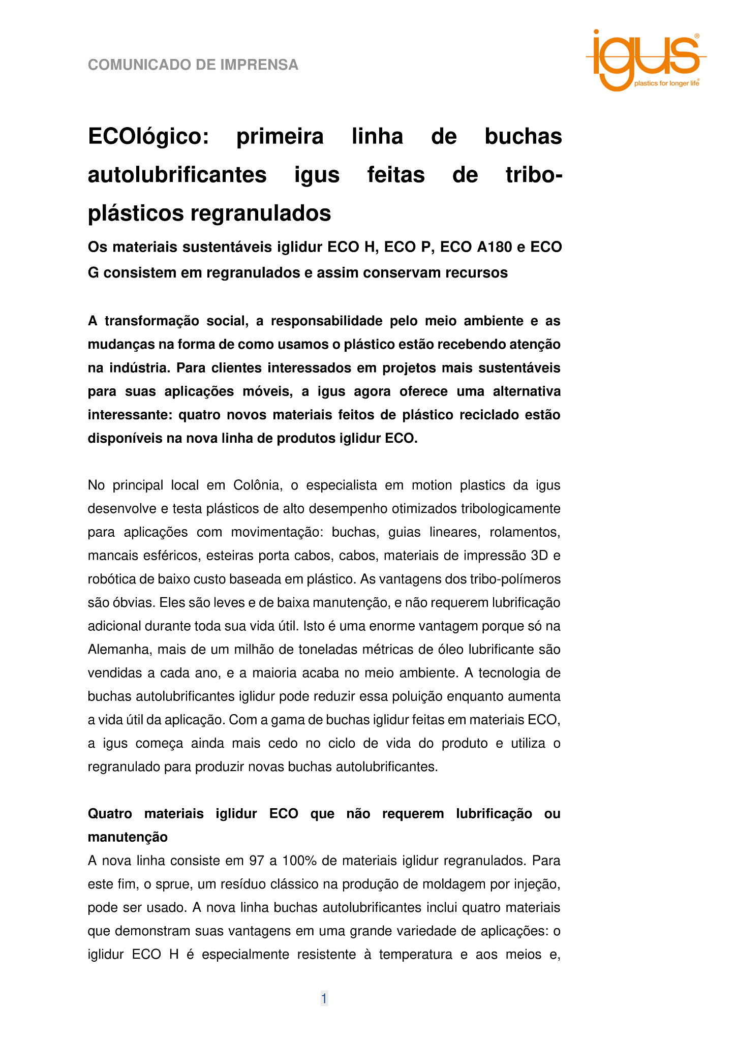 A nova linha consiste em 97 a 100% de materiais iglidur regranulados. Para este fim, o sprue, um resíduo clássico na produção de moldagem por injeção, pode ser usado. A nova linha buchas autolubrificantes inclui quatro materiais que demonstram suas vantagens em uma grande variedade de aplicações: o iglidur ECO H é especialmente resistente à temperatura e aos meios e, portanto, pode ser usado em ambientes altamente corrosivos e quentes. O iglidur ECO P oferece alta resistência mecânica com baixa absorção de umidade e, portanto, é adequado para uso externo. O material acessível do iglidur ECO A180 é adequado para aplicações sensíveis ao preço, enquanto o iglidur ECO G é extremamente robusto e versátil.