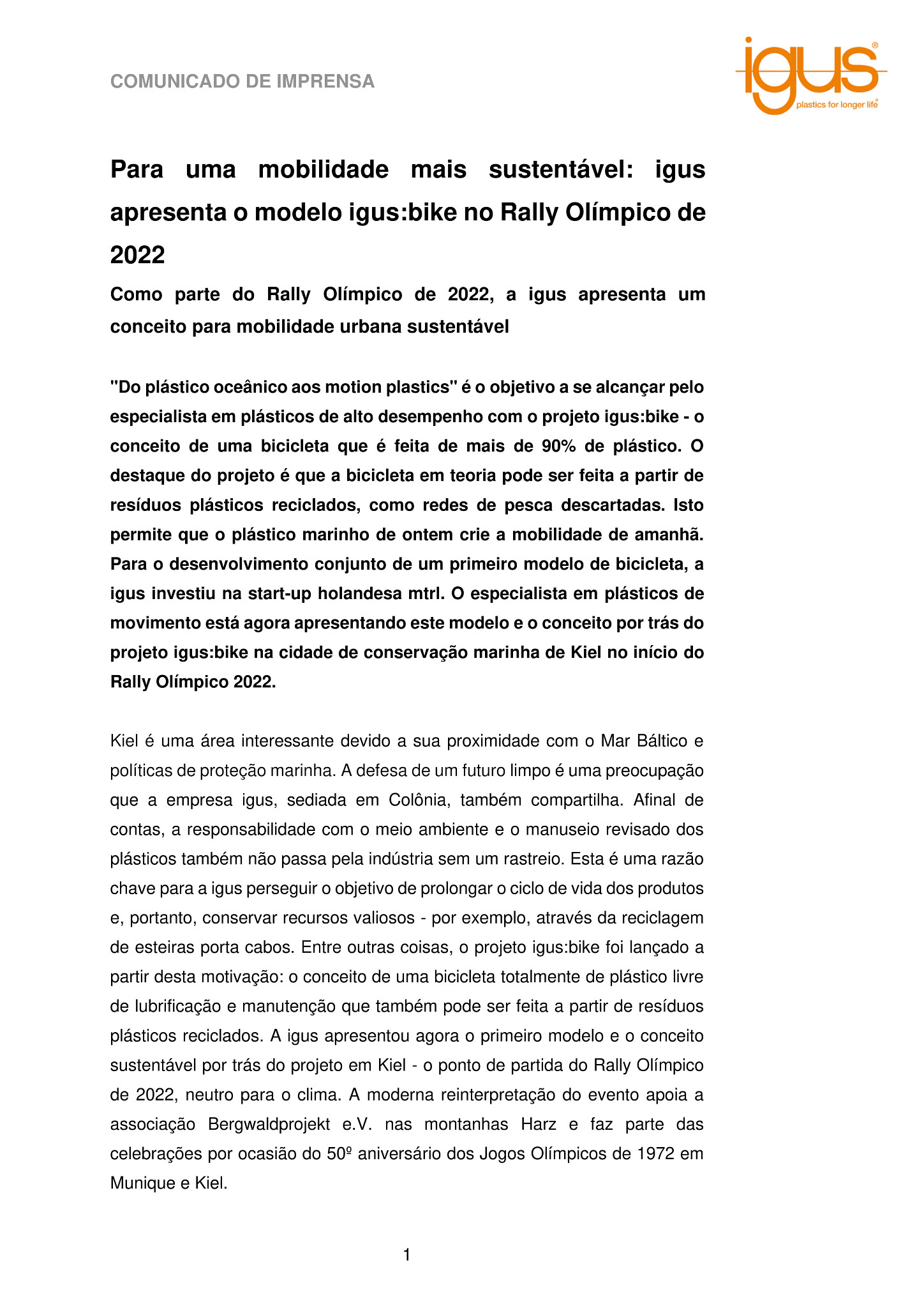 “Do plástico oceânico aos motion plastics” é o objetivo a se alcançar pelo especialista em plásticos de alto desempenho com o projeto igus:bike – o conceito de uma bicicleta que é feita de mais de 90% de plástico. O destaque do projeto é que a bicicleta em teoria pode ser feita a partir de resíduos plásticos reciclados, como redes de pesca descartadas. Isto permite que o plástico marinho de ontem crie a mobilidade de amanhã. Para o desenvolvimento conjunto de um primeiro modelo de bicicleta, a igus investiu na start-up holandesa mtrl. O especialista em plásticos de movimento está agora apresentando este modelo e o conceito por trás do projeto igus:bike na cidade de conservação marinha de Kiel no início do Rally Olímpico 2022.