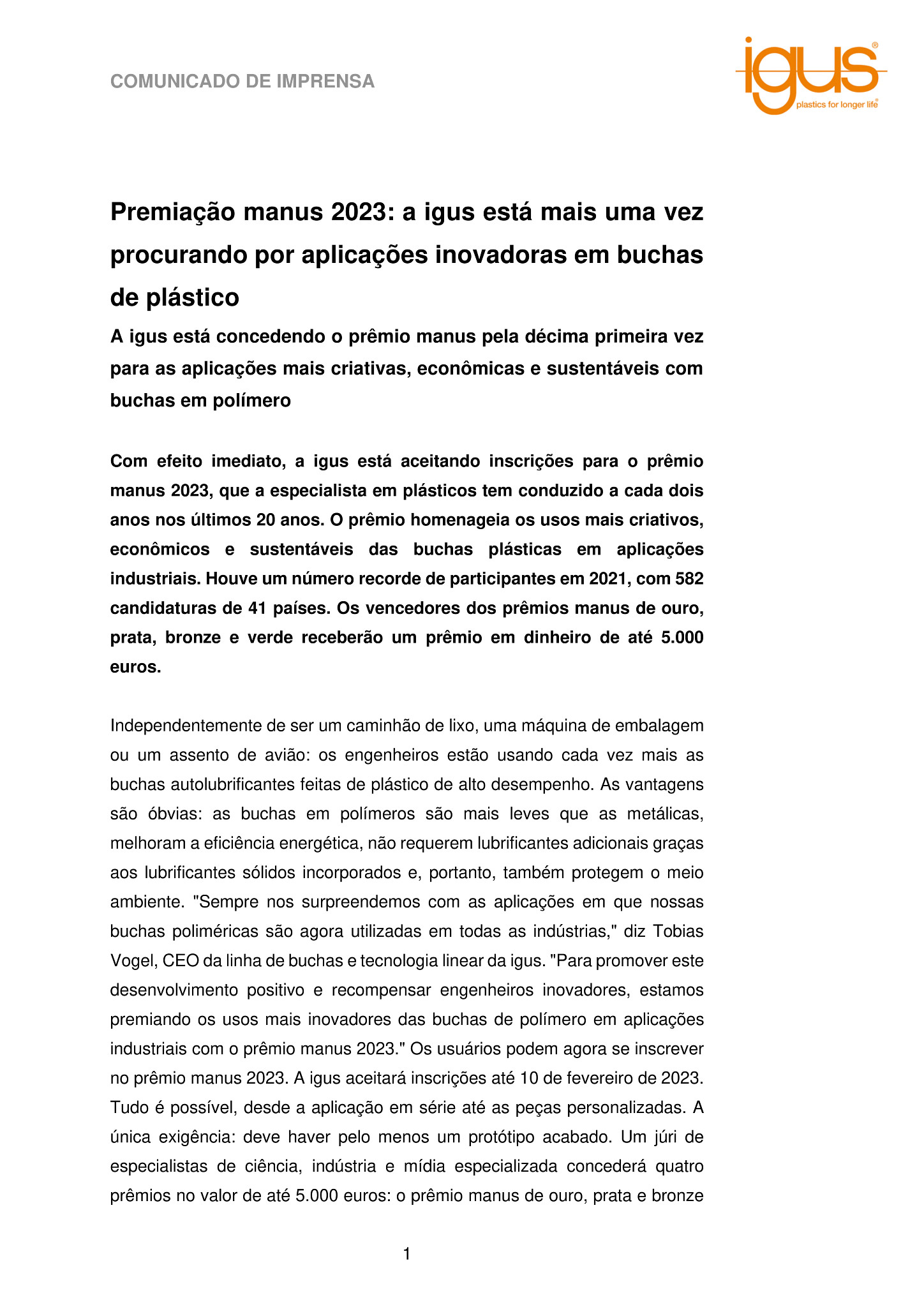 Com efeito imediato, a igus está aceitando inscrições para o prêmio manus 2023, que a especialista em plásticos tem conduzido a cada dois anos nos últimos 20 anos. O prêmio homenageia os usos mais criativos, econômicos e sustentáveis das buchas plásticas em aplicações industriais. Houve um número recorde de participantes em 2021, com 582 candidaturas de 41 países. Os vencedores dos prêmios manus de ouro, prata, bronze e verde receberão um prêmio em dinheiro de até 5.000 euros.