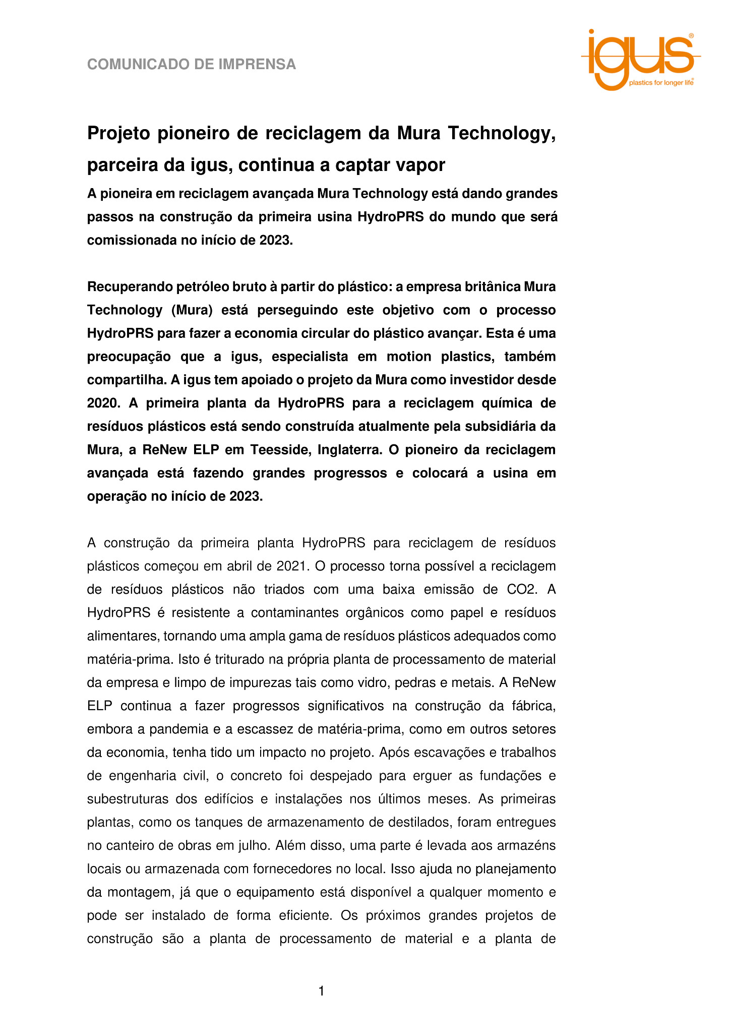 Recuperando petróleo bruto à partir do plástico: a empresa britânica Mura Technology (Mura) está perseguindo este objetivo com o processo HydroPRS para fazer a economia circular do plástico avançar. Esta é uma preocupação que a igus, especialista em motion plastics, também compartilha. A igus tem apoiado o projeto da Mura como investidor desde 2020. A primeira planta da HydroPRS para a reciclagem química de resíduos plásticos está sendo construída atualmente pela subsidiária da Mura, a ReNew ELP em Teesside, Inglaterra. O pioneiro da reciclagem avançada está fazendo grandes progressos e colocará a usina em operação no início de 2023.