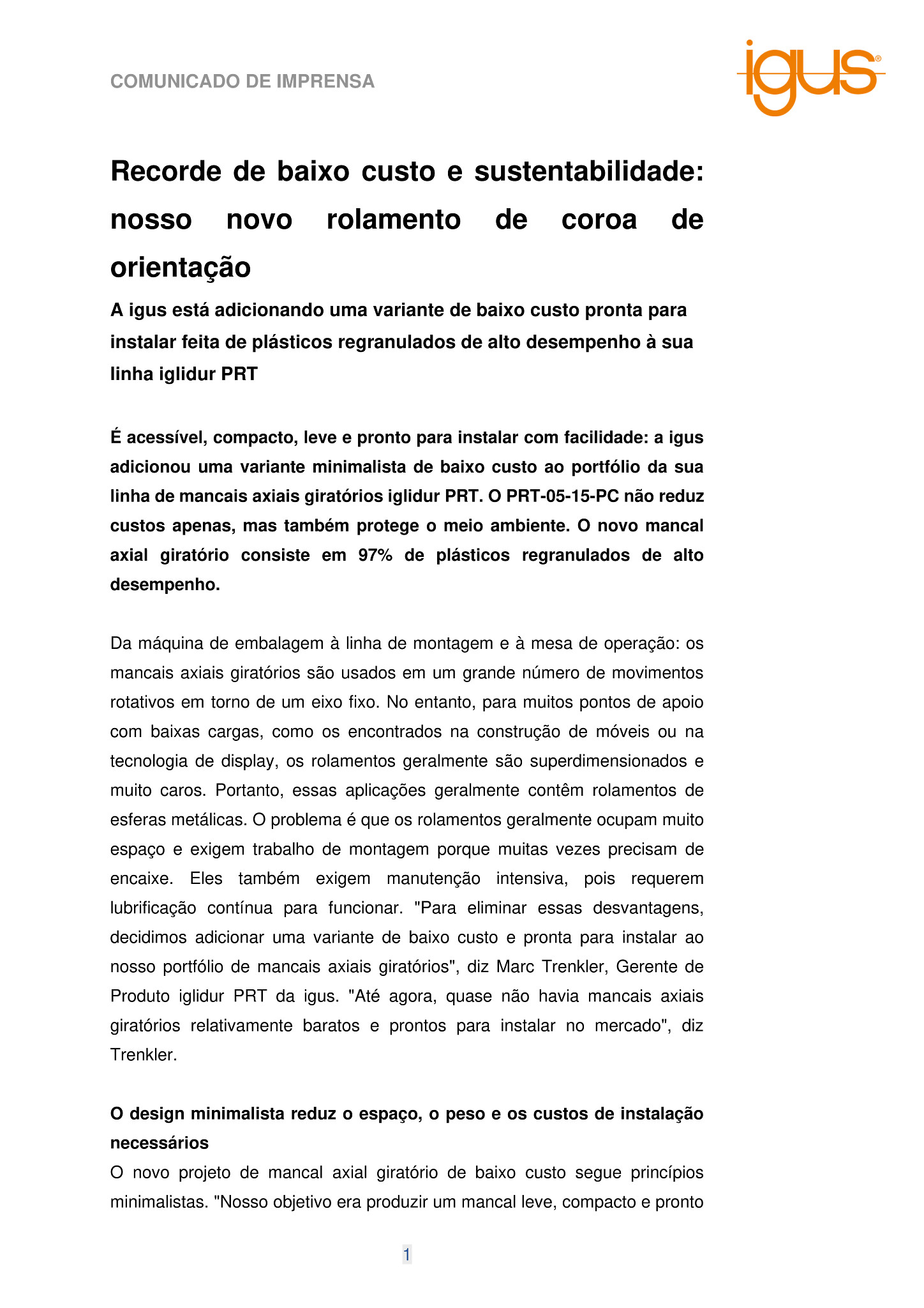 O PRT-05-15-PC não apenas reduz custos, mas também protege o meio ambiente. O novo mancal axial giratório de baixo custo tem uma quantidade de 97% de iglidur M260 regranulado e plásticos de alto desempenho iglidur P4. Estes são materiais, como jito de produção, que já foram processados. Plásticos valiosos são assim salvos da incineração e transferidos para uma economia circular sustentável. O plástico também possui lubrificantes sólidos microscópicos integrados que são liberados durante a operação e permitem operação a seco de baixo atrito sem graxa lubrificante para um efeito ambientalmente amigável adicional, o que é uma grande vantagem. Todos os anos, milhões de toneladas de lubrificantes poluem o meio ambiente. Finalmente, o novo PRT é durável, especialmente ao ar livre. Os mancais de polímero não sofrem corrosão e são resistentes à contaminação por graxa e sujeira. Isso significa que eles não precisam ser substituídos com tanta frequência. “O iglidur PRT-05-15-PC contribui assim para a estratégia de sustentabilidade da UE”, diz Trenkler. Essa estratégia visa tornar a Europa o primeiro continente neutro em termos climáticos até 2050, ao mesmo tempo em que impulsiona o crescimento econômico.