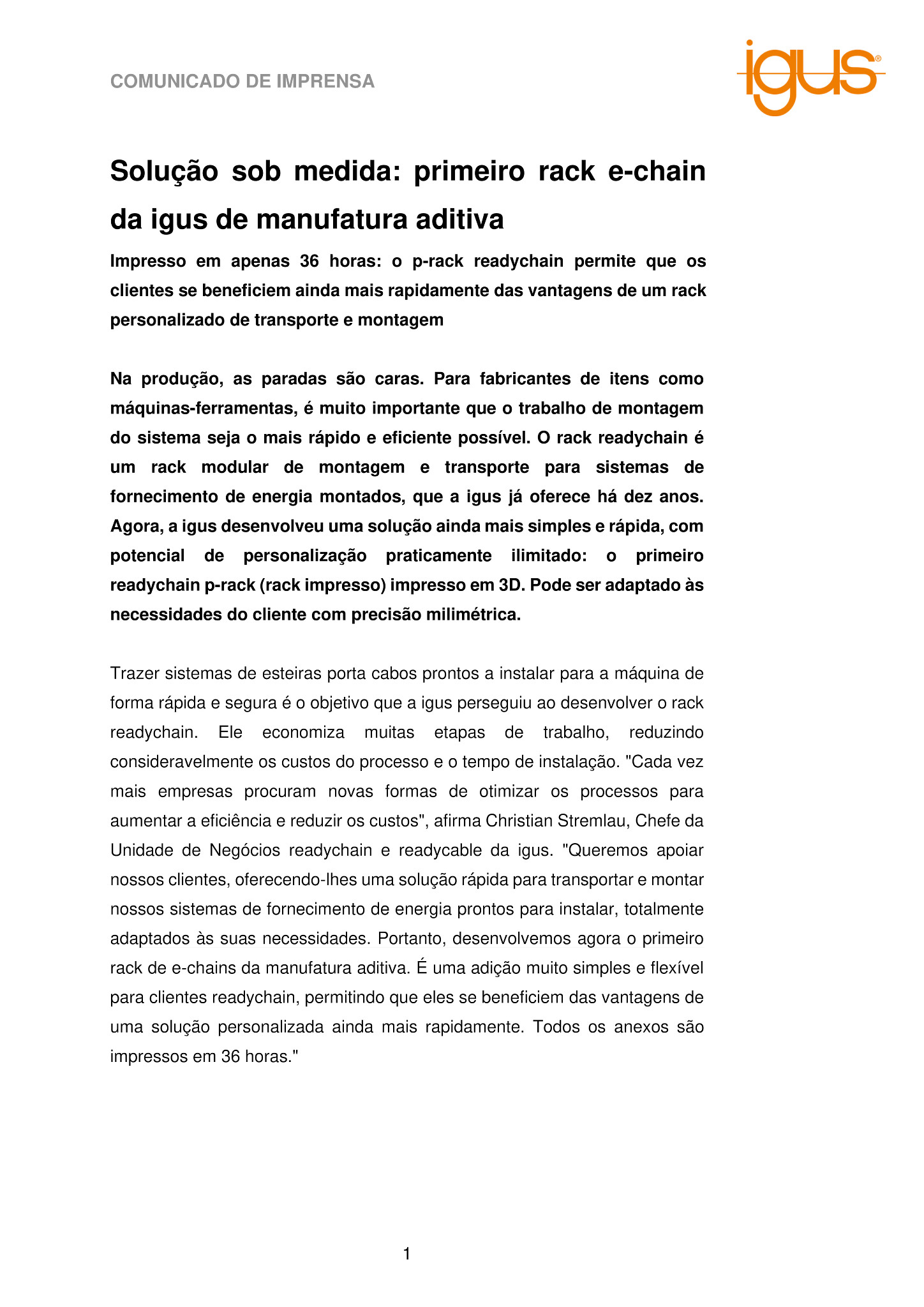 Trazer sistemas de esteiras porta cabos prontos a instalar para a máquina de forma rápida e segura é o objetivo que a igus perseguiu ao desenvolver o rack readychain. Ele economiza muitas etapas de trabalho, reduzindo consideravelmente os custos do processo e o tempo de instalação. “Cada vez mais empresas procuram novas formas de otimizar os processos para aumentar a eficiência e reduzir os custos”, afirma Christian Stremlau, Chefe da Unidade de Negócios readychain e readycable da igus. “Queremos apoiar nossos clientes, oferecendo-lhes uma solução rápida para transportar e montar nossos sistemas de fornecimento de energia prontos para instalar, totalmente adaptados às suas necessidades. Portanto, desenvolvemos agora o primeiro rack de e-chains da manufatura aditiva. É uma adição muito simples e flexível para clientes readychain, permitindo que eles se beneficiem das vantagens de uma solução personalizada ainda mais rapidamente. Todos os anexos são impressos em 36 horas.”