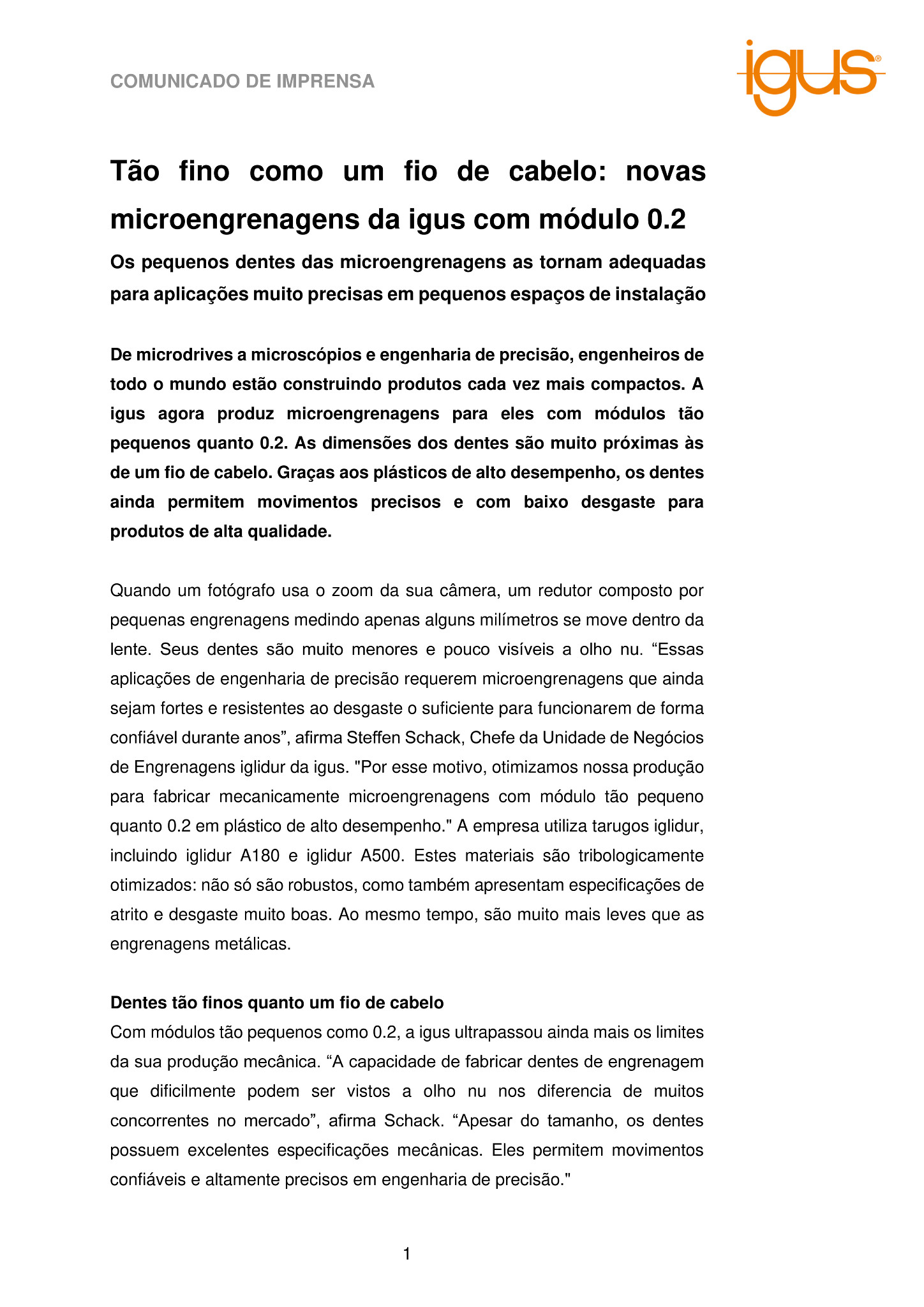 A igus agora oferece a produção de microengrenagens feitas de plásticos de alto desempenho, específicas para o cliente. “A nossa produção mecânica a partir de tarugos iglidur permite preços econômicos mesmo em pequenas quantidades. Podemos produzir grandes quantidades com moldagem por injeção – para produção em série de automóveis, por exemplo”, diz Schack. As engrenagens são adequadas para uma ampla gama de aplicações que exigem movimentos coordenados com precisão em espaços de instalação muito pequenos, por exemplo, microscópios e outros instrumentos ópticos, motores em miniatura e microdrives.
